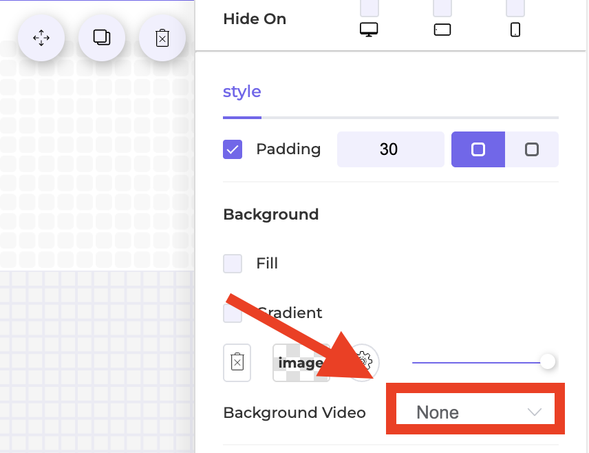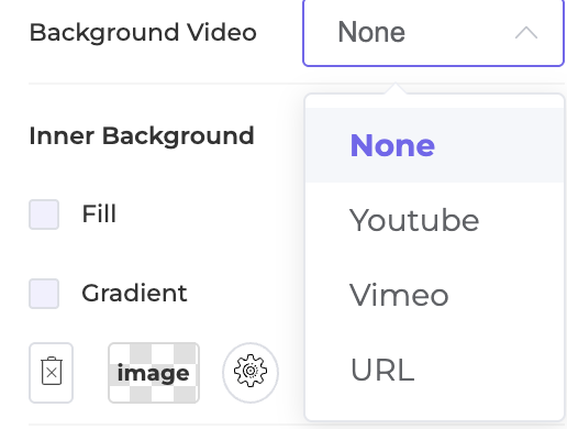 Pinpointe's Landing Page (LP) Builder allows a user to add a background video to a page section. After editing your LP, look at the Background Video drop-down menu on the Section Settings on the right (Fig 1). If the Section Settings aren't visible, click on the gear icon in the lower-right of the screen.