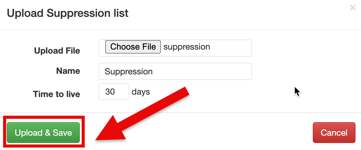 On the Upload Suppression List window, upload your file and click on Upload & Save (Fig 3). The only file types we support are CSV and TXT. All that's required are email addresses with no other data fields. Note that your file can contain email addresses in 'normal' and/or 'MD5' format. The file can contain both formats in the same file. Ideally, the file should be a single column of data, or a single row of comma separated values. Email addresses provided in 'normal' format will be converted to MD5 upon upload, so once uploaded, all email addresses in transient suppression lists are stored in MD5 format only.