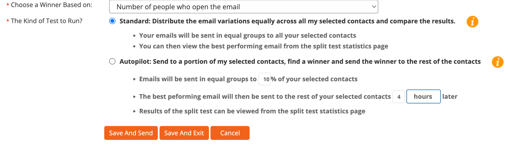 An autopilot test takes a percentage of your list, which you can define, and sends it to that portion of your database. Once the results are in and a winner is determined, Pinpointe will send the winning email to the remainder of your database. For example, if you defined 10% as the percentage upfront, the percentage of people on your list that would receive the winning email would be 90%.